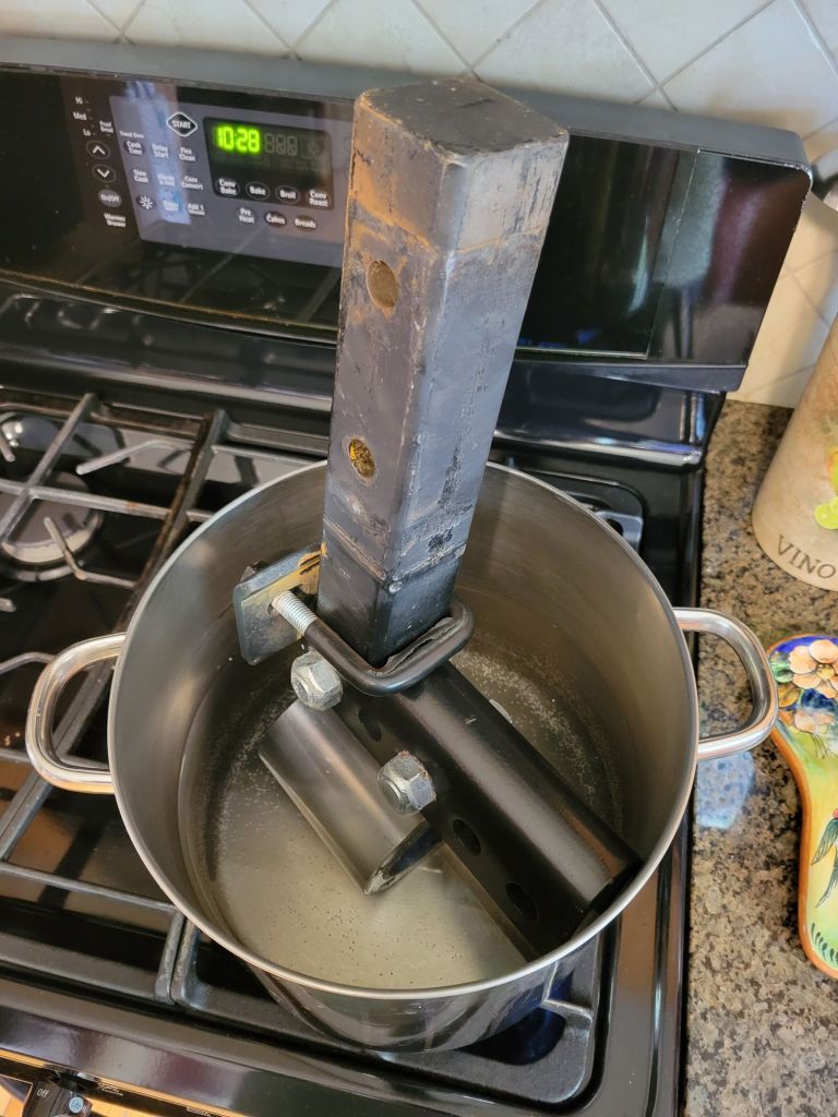 Unfortunately, he couldn’t get the darn thing out. He tried everything, including all of the suggestions people had on YouTube. Finally, he called the manufacturer for help, and they told him to boil the hitch for 30 minutes.