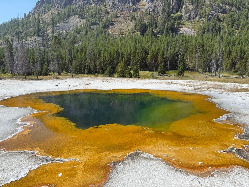 We kept driving and arrived at West Thumb Geyser Basin. This is another thermally active spot in Yellowstone, right on the edge of Yellowstone Lake. In fact, some of the steam vents and geysers are under the water.