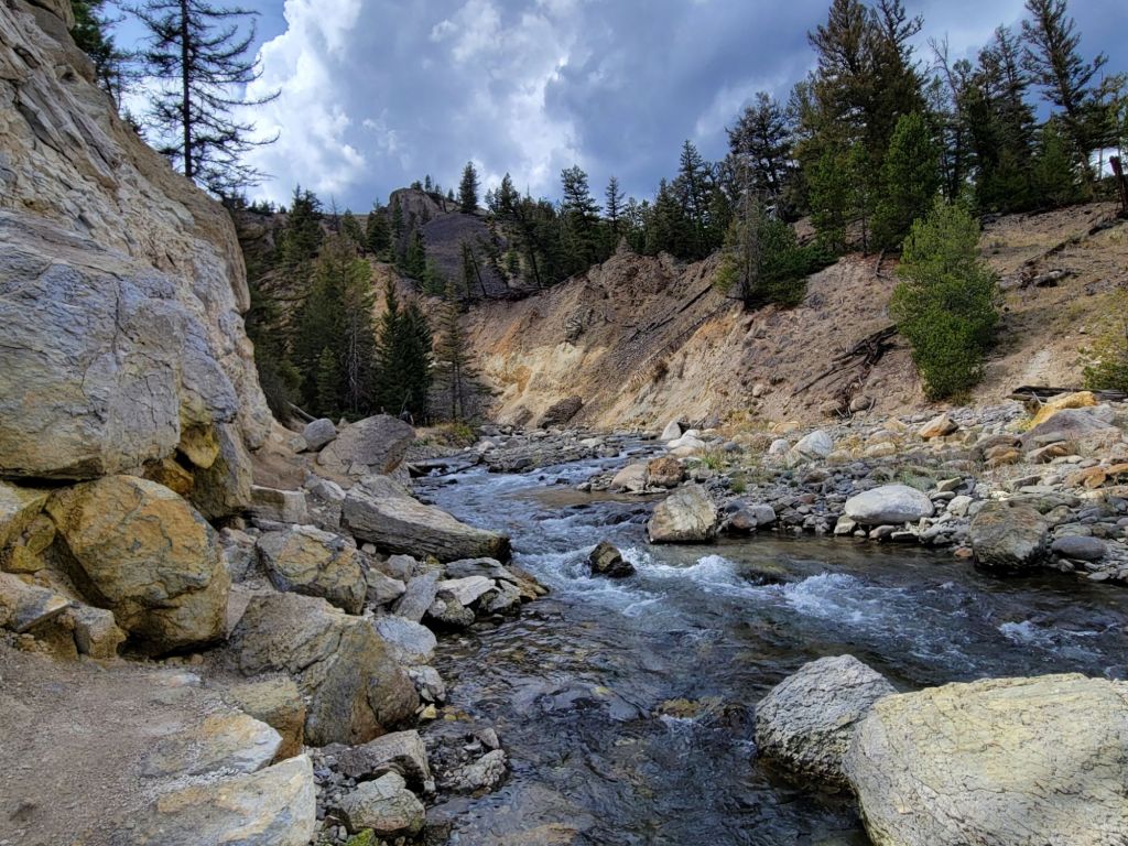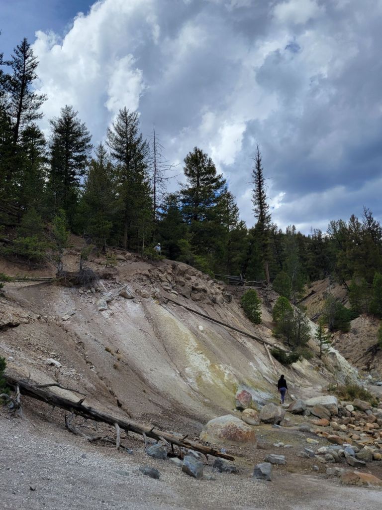 Next, we headed to Calcite Spring. I had been wondering why I was still smelling sulfur since I hadn’t seen any steam rising anywhere. I didn’t wonder any longer after I saw the geyserite on the walls of this gorge.